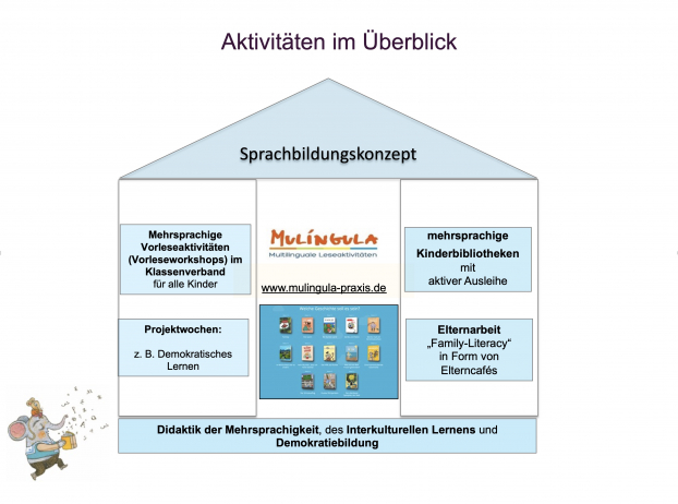 Das unten abgebildete Haus bildet mögliche Mulingula-Aktivitäten am Lernort Schule ab. Die Grundlage ist eine zeitgemäße Didaktik der Mehrsprachigkeit, des interkulturellen und demokratischen Lernens. Auf dieser Basis wird die sprachliche und kulturelle Heterogenität der Schülerschaft als Potenzial und Chance für bildende und erzieherische Prozesse angesehen.